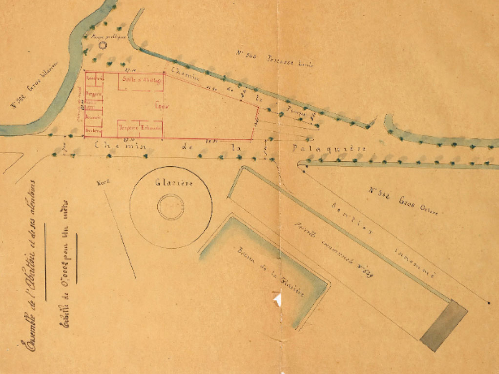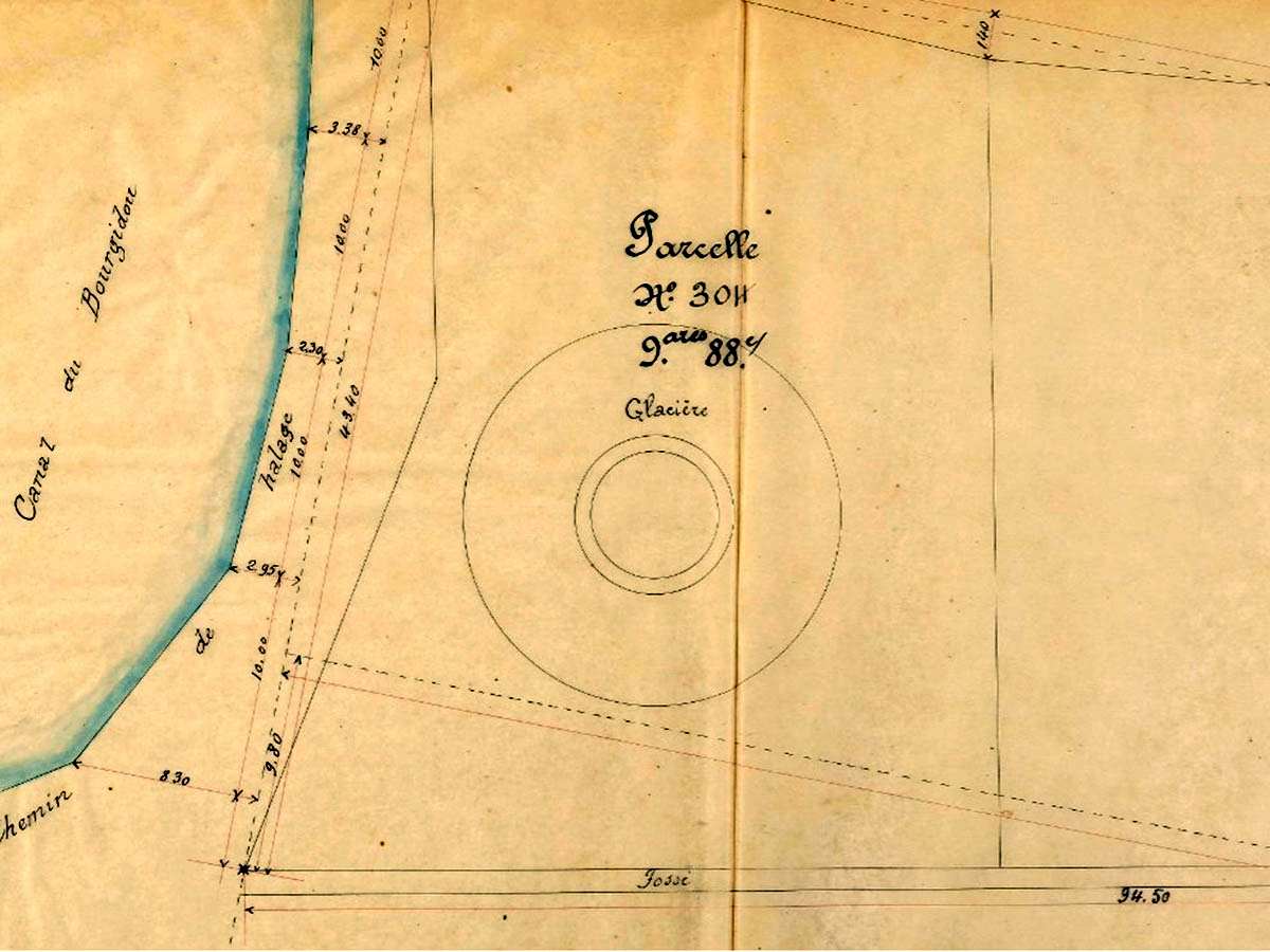 Les informations sur les deux dernières glacières provenant uniquement de plans, il n’y a pas de précision sur leur type de construction, si ce n’est le fait qu’elles semblent dessinées comme étant enfouies sous une montille. Les plans proviennent des deux projets présentés le 15 septembre 1882 et étudiés jusqu’en 1883 concernant la construction d’un abattoir sur Aigues-Mortes. Le premier projet d’étude est situé sur le chemin de la pataquière, l’autre à l’angle droit de l’ancien canal du Bougidou. Sur les deux sites sélectionnés, on note sur les plans la proximité d’anciennes glacières déjà existantes à ces deux endroits. Ce n’est probablement pas un hasard. Peut être était-il envisagé de conserver la viande fraichement abattue dans de la glace, des pièces de préparation sont en effet prévues sur les plans du futur bâtiment (échaudoir, triperie et fourneaux). On sait que c’est le projet de l’angle du vieux canal de Bougidou qui fut choisi et ou fut construit l’abattoir, dont une partie est encore visible aujourd’hui à l’est de l’avenue Frédéric Mistral. L’ancienne glacière du Bourgidou a donc été détruite lors de la construction de l’abattoir et celle de la pataquière a peut être suivi. Il est possible qu’une modification tardive du projet ait scellé le sort des glacières dont on n’avait finalement plus besoin, mais ce n’est qu’une hypothèse. Finalement la seule glacière encore visible à Aigues-Mortes est située aux remparts Est, porte de la reine, au milieu d’un terrain privé planté en vignes depuis de nombreuses années. D’anciens propriétaires y ont fait ouvrir une porte moderne côté sud pour y accéder. Le bâtiment est utilisé comme Mazet de nos jours.